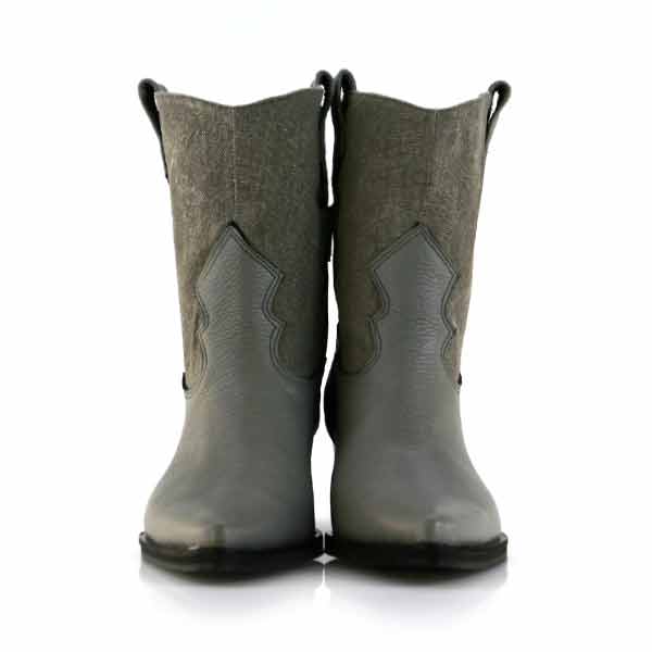 The Stellar Denim cowboy-inspired boots are made from gray textured-leather, matched with fabulous gray delave denim. Leather inside. Set on chunky cuban heels, very comfortable to wear all day long. This pair has the label's Stellar Denim symbol on the pull tabs. Style them with a midi skirt, with mini hemlines, trousers, or even a night dress.
