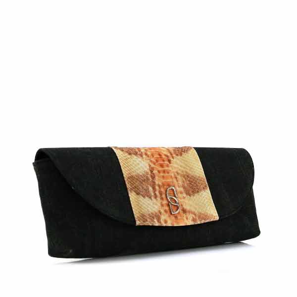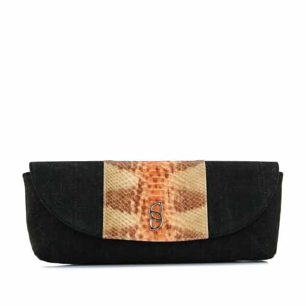 The Stellar Black Délavé clutch bag with beige python snake effect leather, is a fabulous bag to accompany you all day long. A special clutch with lots of space inside for your essentials, makes it an ideal bag for every modern woman. Internal pocket for small essentials. Excellent size, to hold it under your shoulder or in your hand and immediately elevate your style. The Stellar Denim modern clutch bag is punctuated with the Stellar Denim symbol.